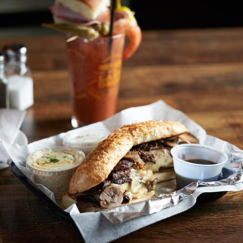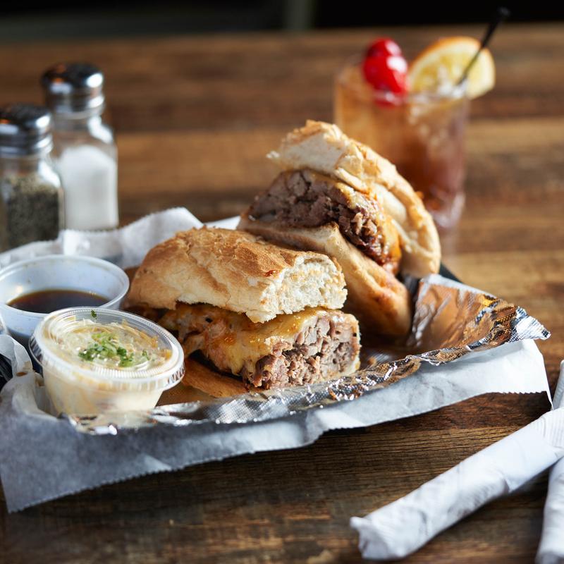 Slow-roasted prime rib sliced thin and piled high, covered with sautéed mushrooms and onions, topped with melted Swiss and Muenster cheese on a French baguette with a side of rich beef broth for dipping.