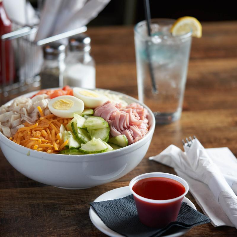 Chopped lettuce, tomatoes, cucumber, hard-boiled eggs, ham, turkey, American and Swiss cheese.