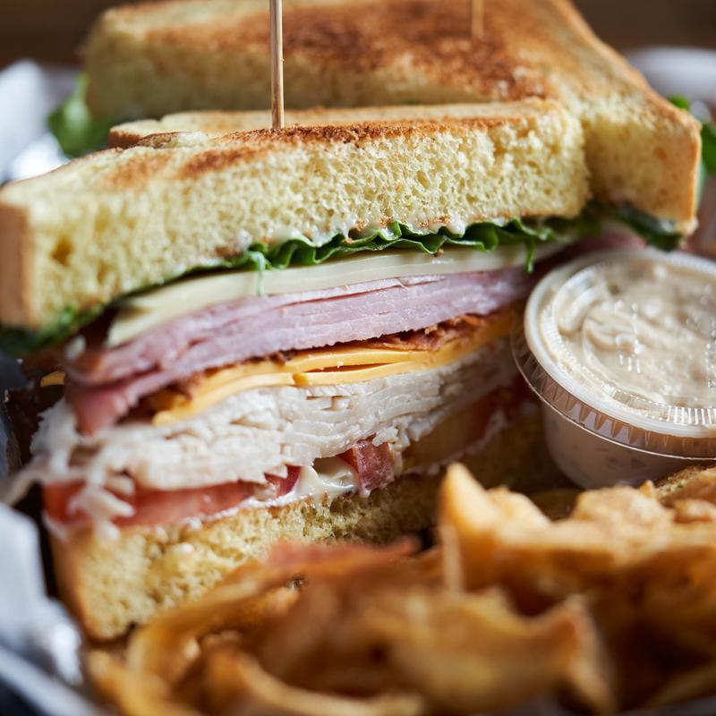 Sliced turkey, ham, American and Swiss cheeses, smoked bacon, lettuce, tomato and mayo on Texas toast.