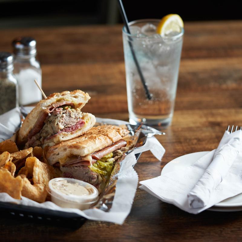 Porkloin, smoked ham, salami, Dijon mustard, sliced pickles, and Swiss cheese on a Cuban roll.