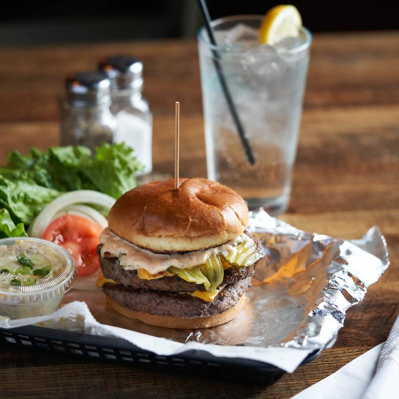 Two patties with American cheese, sliced pickles and 1000 Island dressing.