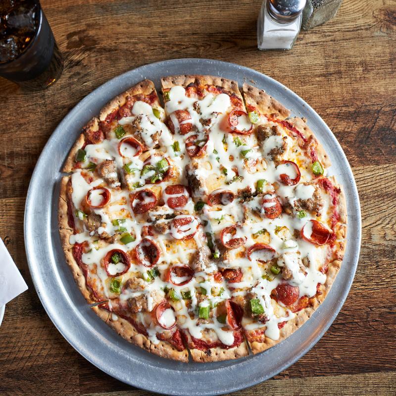 Cheese, sausage, fresh garlic, pepperoni, green pepper, with ranch drizzle.