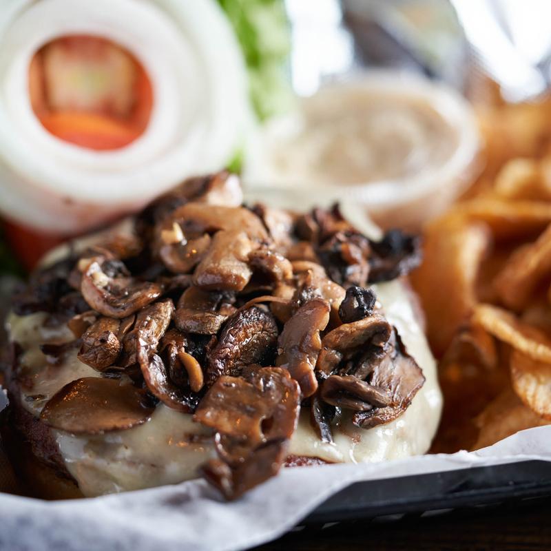 Covered with sautéed mushrooms and Swiss cheese and drizzled with truffle oil.
