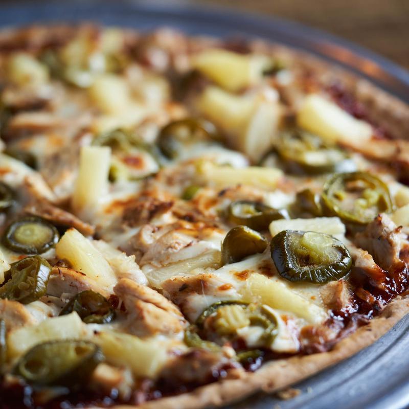 BBQ sauce, chicken, pineapple, jalapeños, cheese.