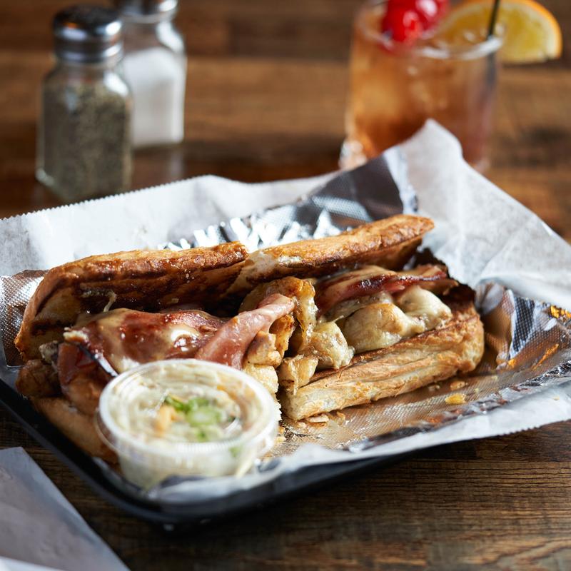 Tender marinated chicken, grilled on a French baguette with smoked ham and Swiss cheese served with a Dijon mayo.
